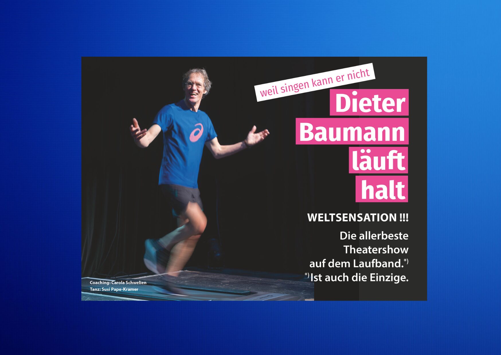 Außer vielleicht noch witzige Geschichten erzählen. Doch diesmal macht er beides, er erzählt beim Laufen – auf einem Laufband. Auf der Bühne so noch nie dagewesen!